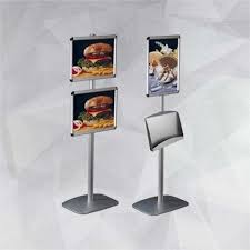 Dekoratif Menü Pano Fuarlada, galerilerde, restoranlarda kullanımıyla kolaylık sağlar. Yatay ve dikey olarak kullanılabilir. Poster konumuna göre yatay-dikey ayarlanabilen çerçevesi mevcuttur. Görsel alanı A4 ve A3 ebatları bulunur. Taban dekoratif bir görünüme sahiptir ve toz boyalıdır. Ağırlığı sayesinde kalabalık alanlarda rahatlıkla kullanabilirsiniz. Standart üründe çerçeve köşeleri rondoludur. Demonte olarak paketlenir. Montaj ve sabitleme malzemeleri ile kurulum şeması paketin içinde yer alır.